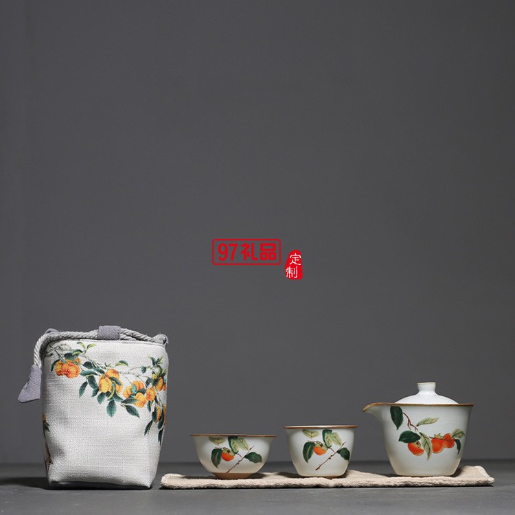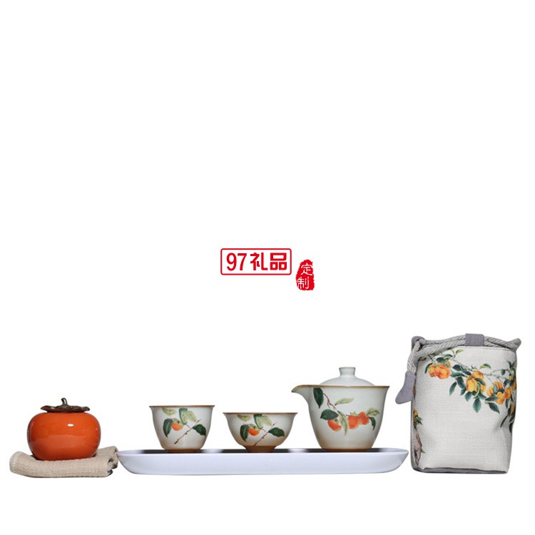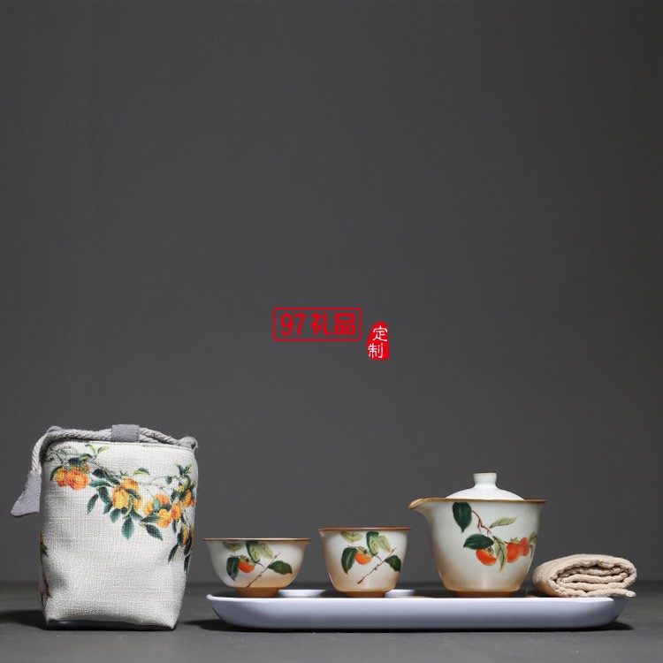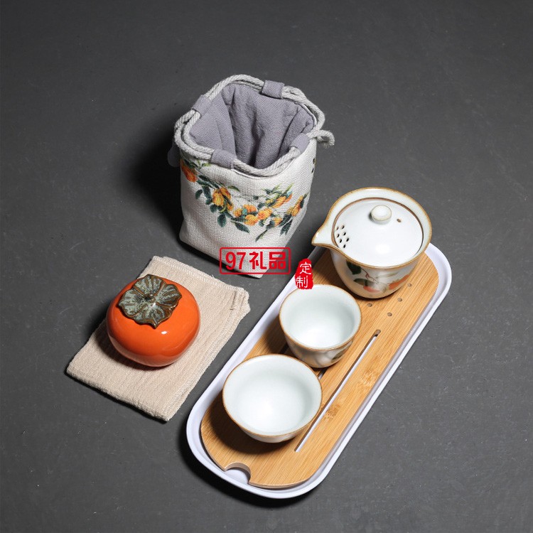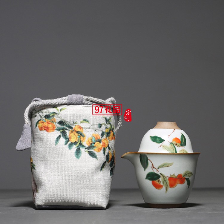汝窯復古柿子快客杯一壺二杯茶具套裝布包便攜旅行套組