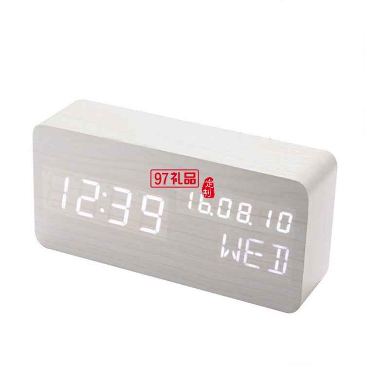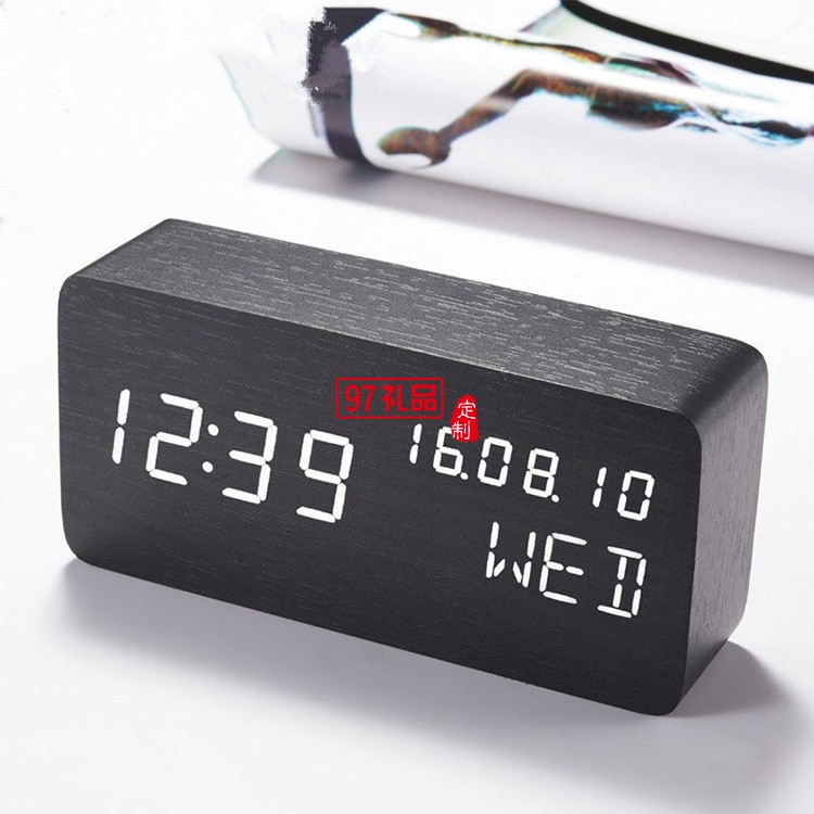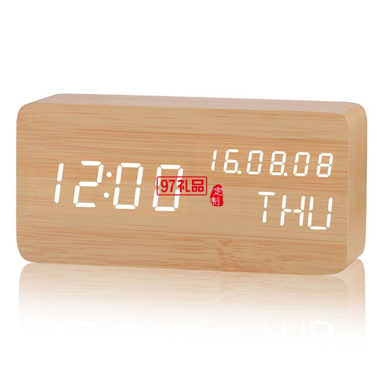 長方形萬年歷木鐘桌面 led電子聲控木頭鐘學(xué)生喚醒鬧鐘