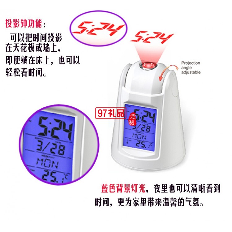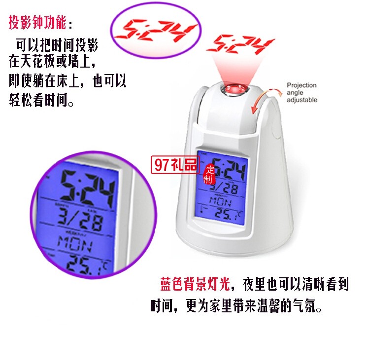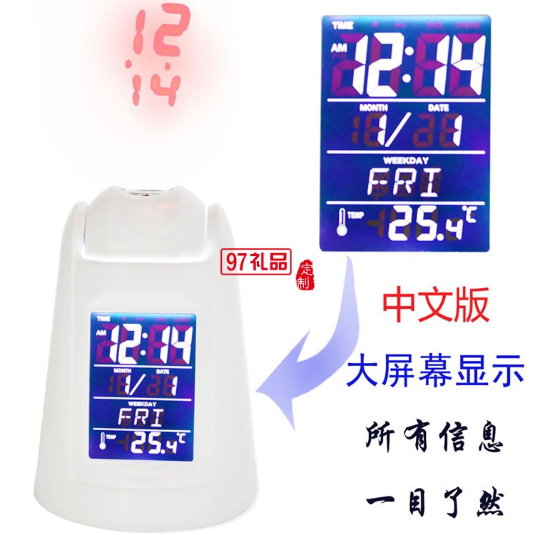 投射時間功能,聲控背光功能:聲音或振動可點亮背光??砷_啟/關閉選擇,語音報時:多國語言可選(單機只有一只種語言) 背光燈,萬年歷,數(shù)字溫度計,鬧鐘/貪睡功能,整點報時 倒計時功能 數(shù)量:100PCS/CTN 毛重:17.8KGS 凈重:16.8KGS 規(guī)格:48.6*48.6*52.3CM 產(chǎn)品尺寸:8.8*8.8*11.5CM
