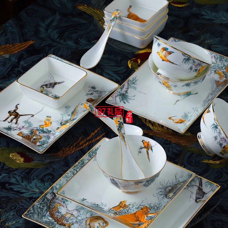 HERMES”愛馬16頭骨陶瓷鎏金餐具套裝赤道叢林系列方形盤碗碟勺禮