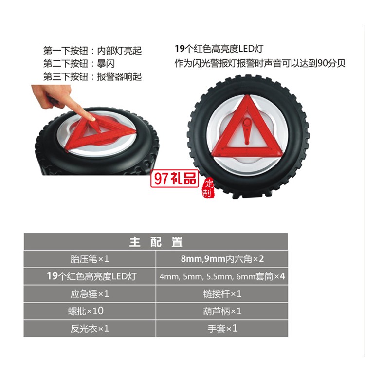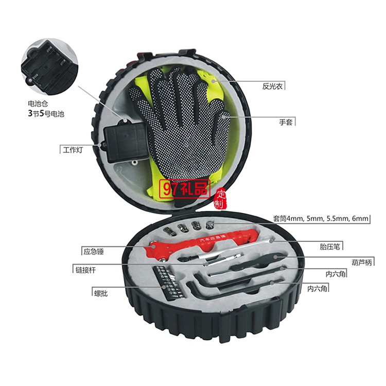 結(jié)構(gòu):4pcs套筒 1pc胎壓筆 1pc應(yīng)急錘 1pc葫蘆柄 1pc鏈接桿 1pc批條 2pcs內(nèi)六角工具 1pc反光衣 1pc手套 1pc閃光警報(bào)燈