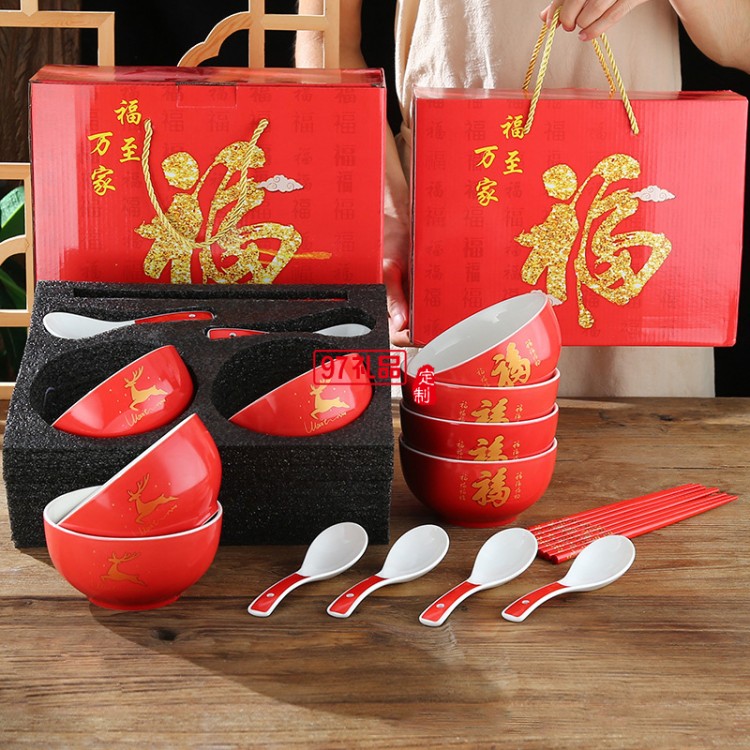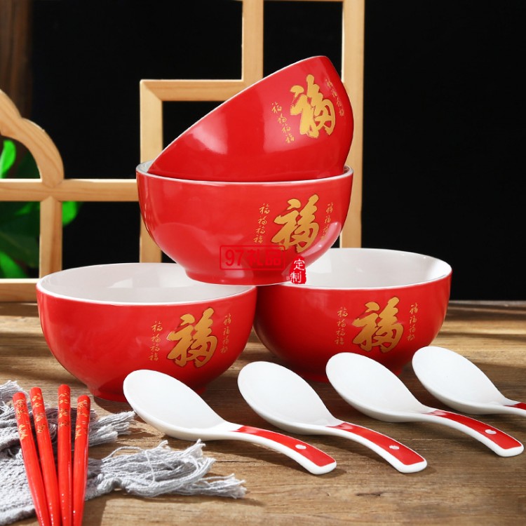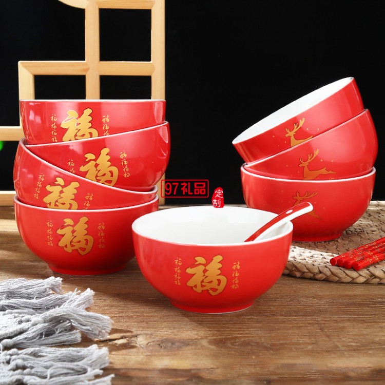 陶瓷福字碗紅色壽碗新年禮品碗虎年碗餐具碗筷定制燒刻字婚慶