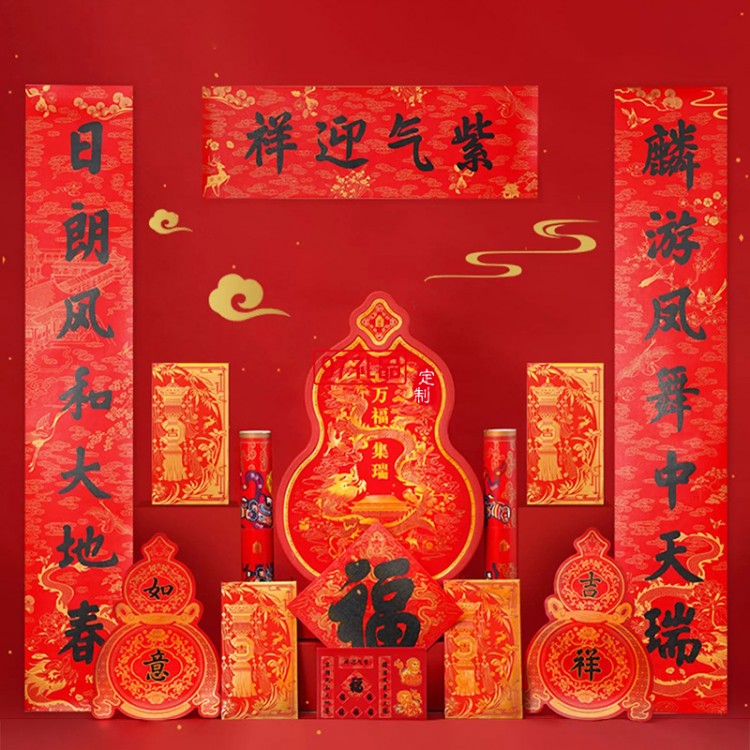 規(guī)格 1套( 春聯(lián)1對:大福字1;橫批1:小福字55;門神一對;冰箱貼1套;紅包*6;福祿春條*4; 窗花*2; 隔條組件1套;無痕點膠60枚: 葫蘆外盒1l; 禮品袋11)