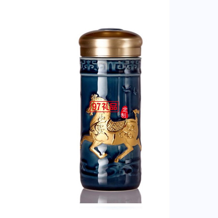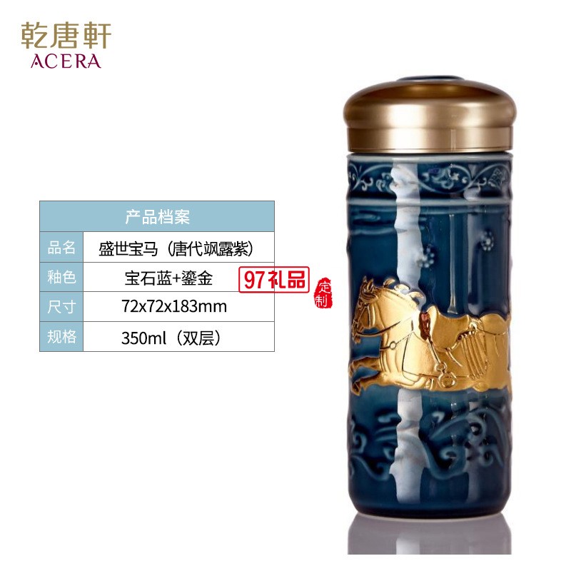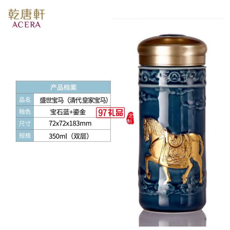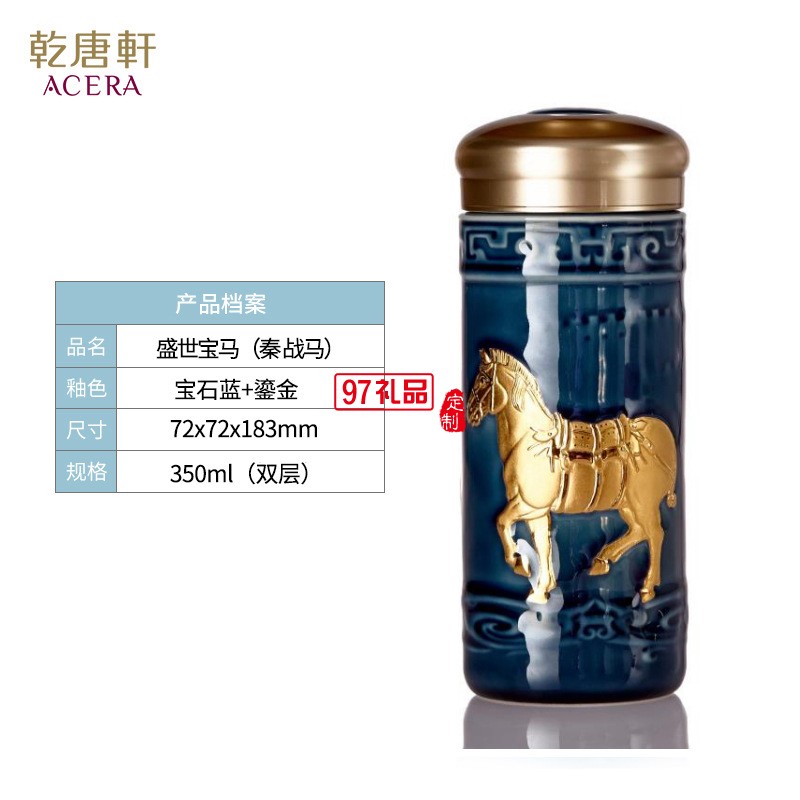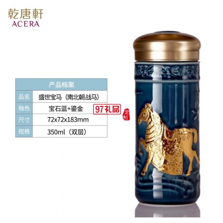 乾唐軒活瓷盛世寶馬隨行杯350lml雙層商務(wù)隨手禮高檔禮品杯子定制