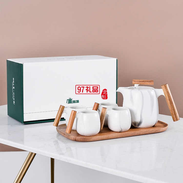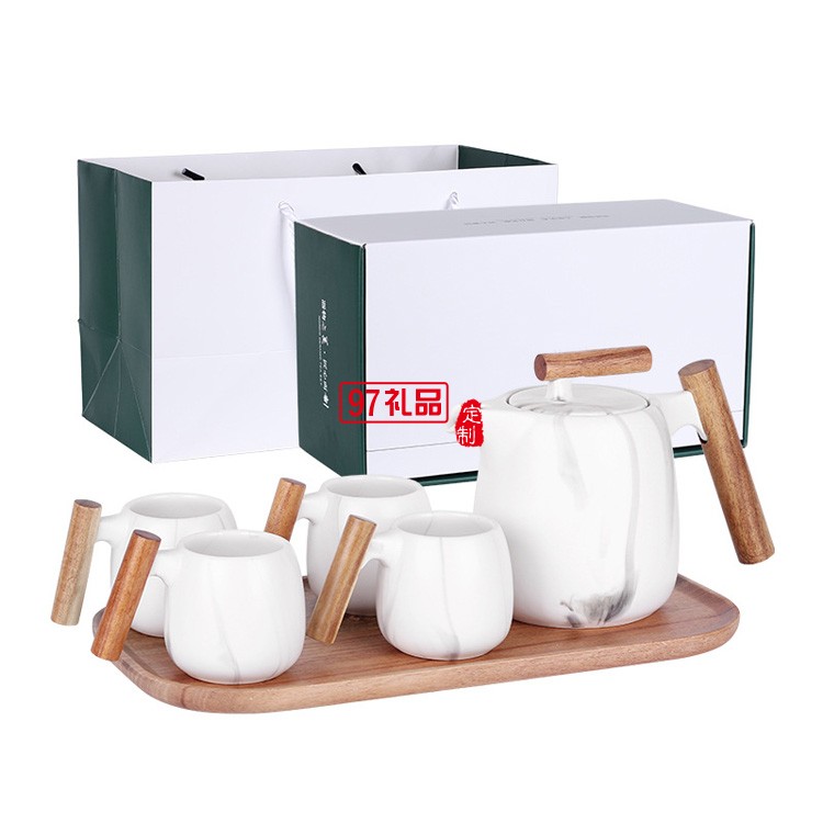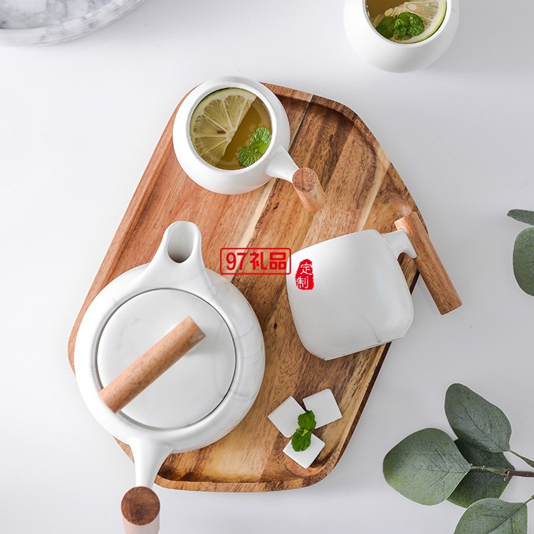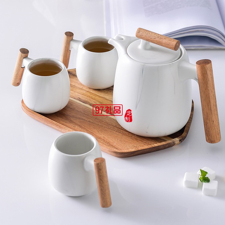 北歐創(chuàng)意簡約茶壺木手柄咖啡陶瓷茶具禮盒套裝花茶壺