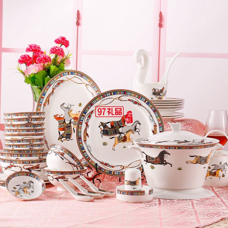HERME愛(ài)馬60頭餐具套裝禮盒碗盤(pán)碟景德鎮(zhèn)骨瓷釉中彩陶瓷喬遷結(jié)婚