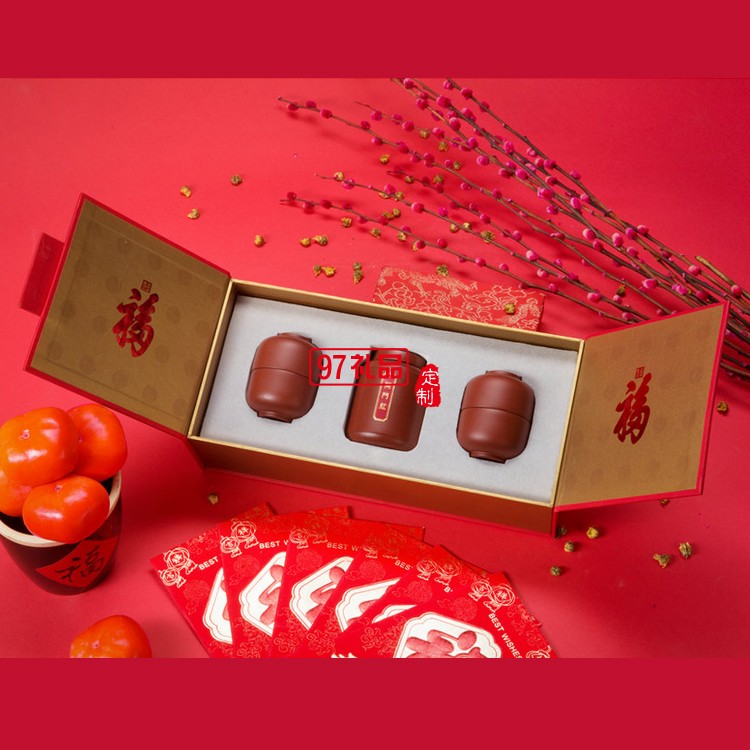 “開(kāi)門紅”系列茶禮,取宜興紫砂紅泥,經(jīng)名匠精心手作,技藝精湛,巧奪天工。