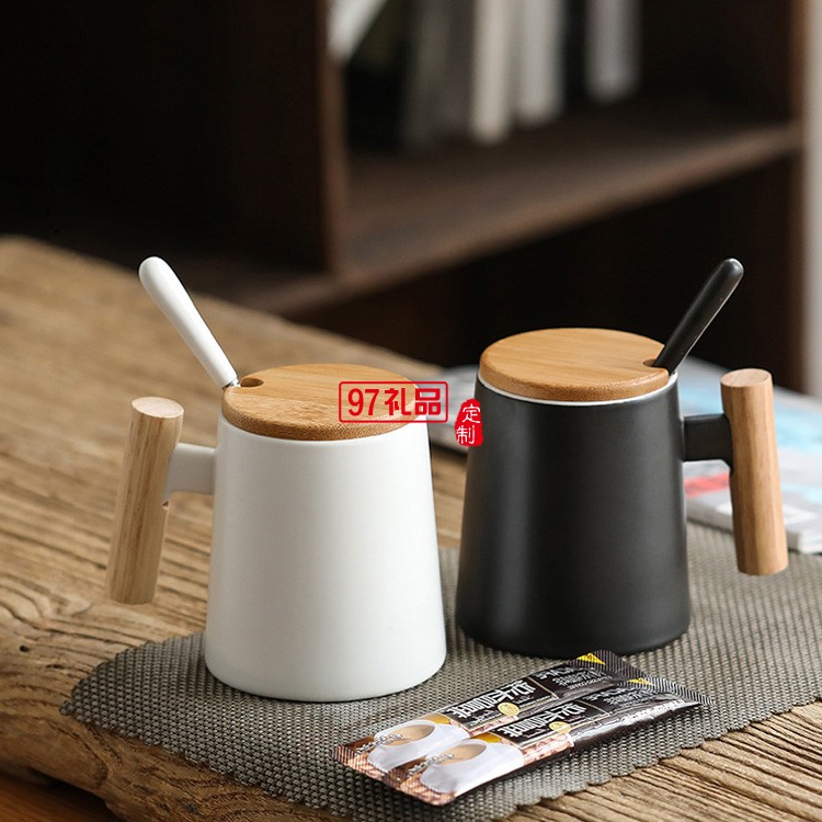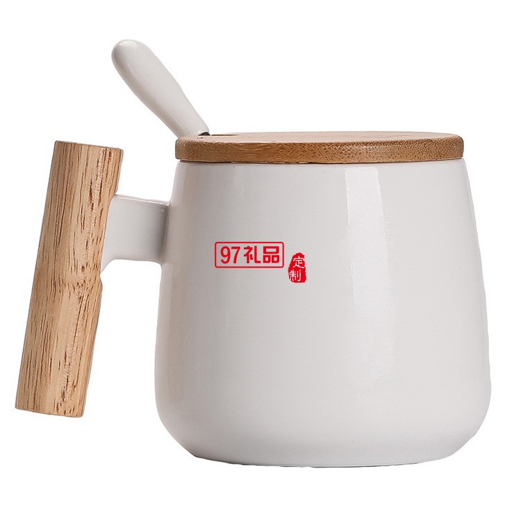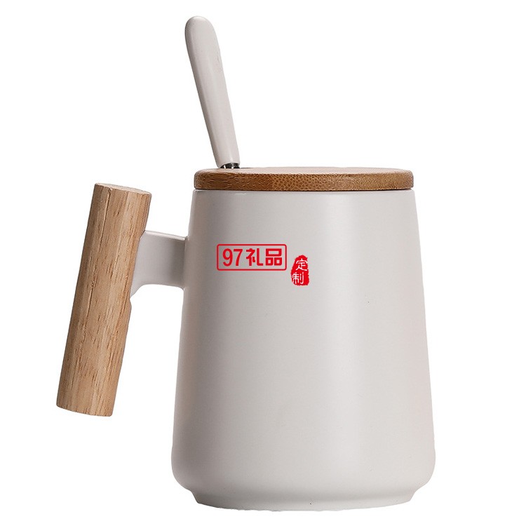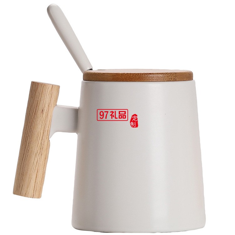 高端木手柄陶瓷杯馬克杯咖啡水杯帶蓋勺禮品杯子定制