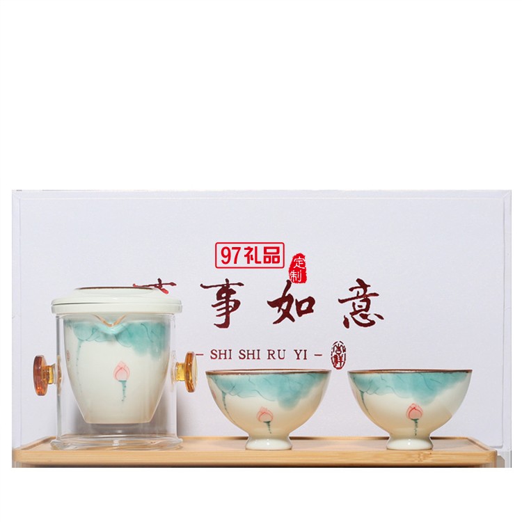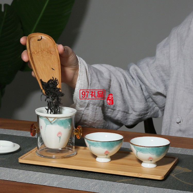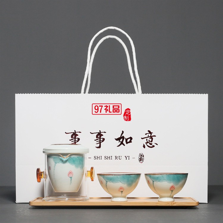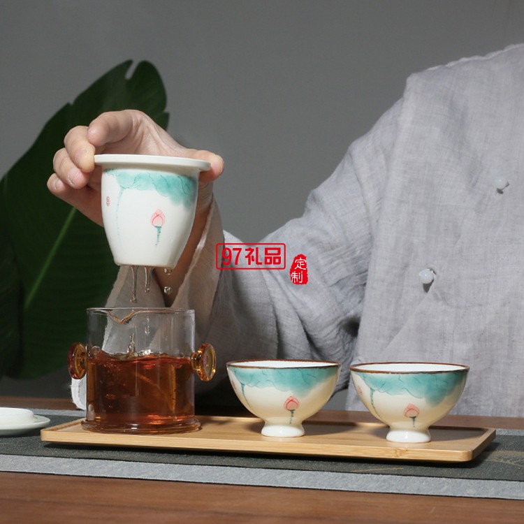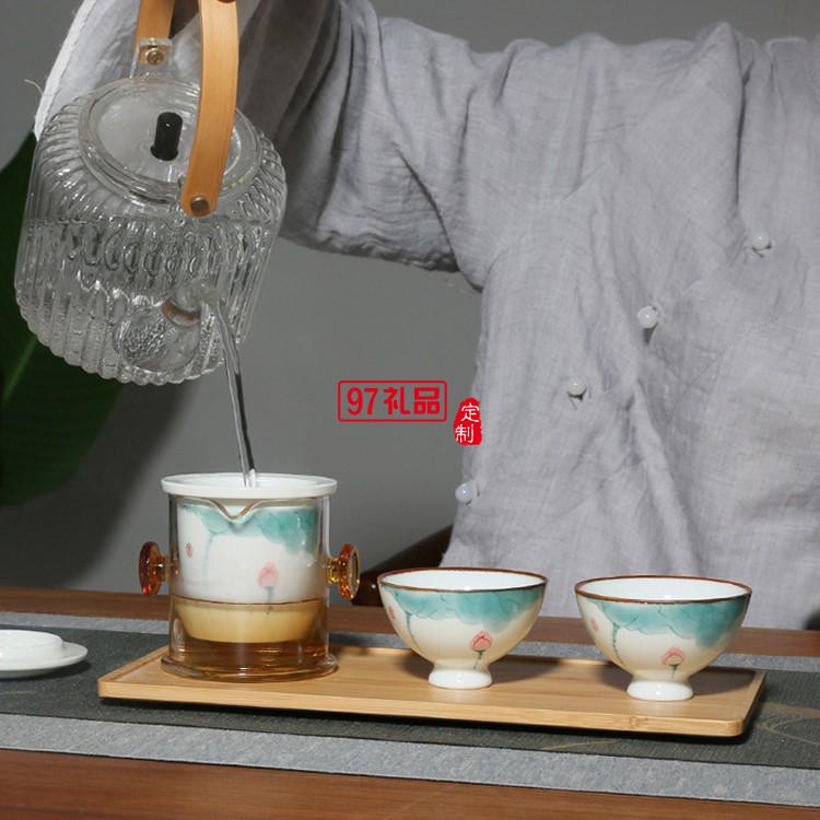 手繪荷花一壺二杯紅茶泡茶具套裝便攜陶瓷茶壺泡茶器辦公室禮品