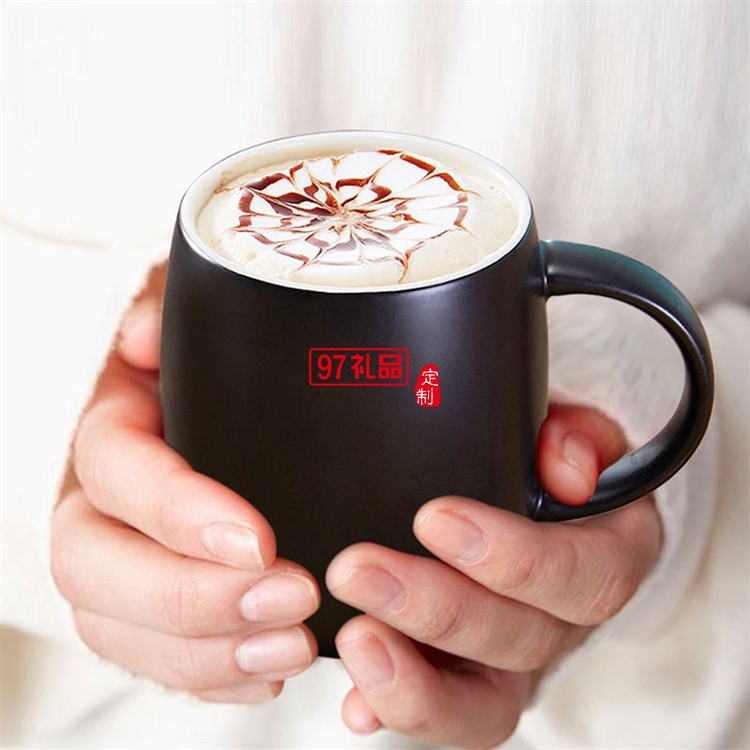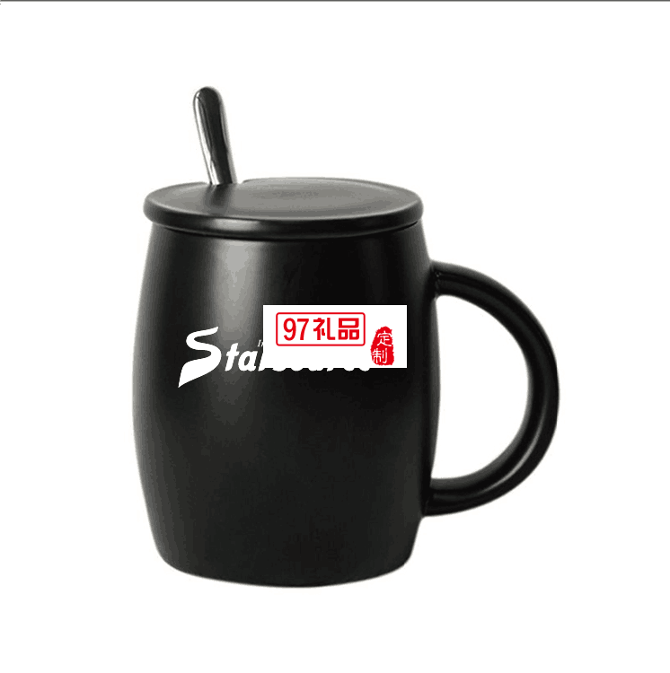 陶瓷水杯 450ml帶蓋帶勺馬克杯 亞光酒桶咖啡杯禮品杯子定制