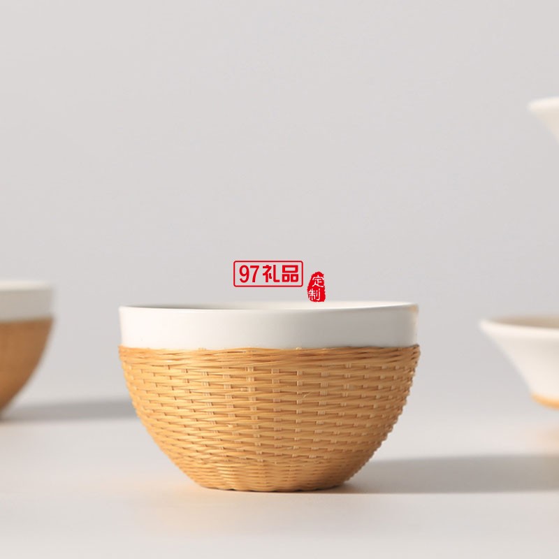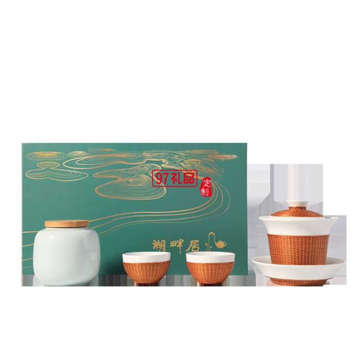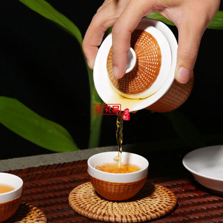 竹絲扣瓷瓷胎竹編手工制作青玉瓷一蓋碗二杯一茶葉罐滌塵