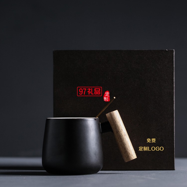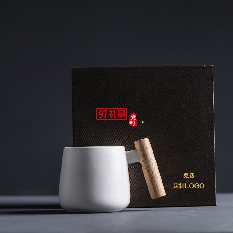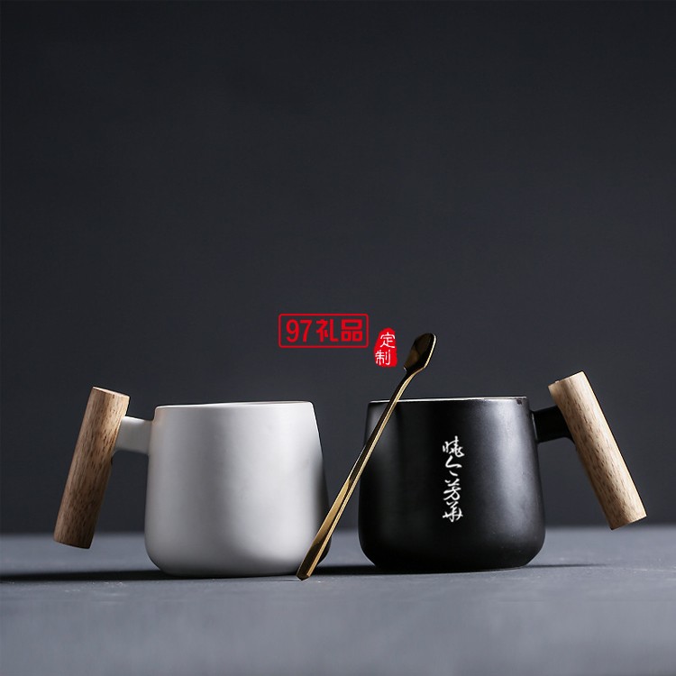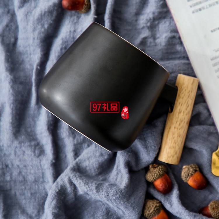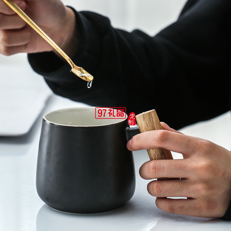 北歐ins風(fēng)簡(jiǎn)約陶瓷木柄馬克杯黑白情侶咖啡杯辦公室水杯禮品logo