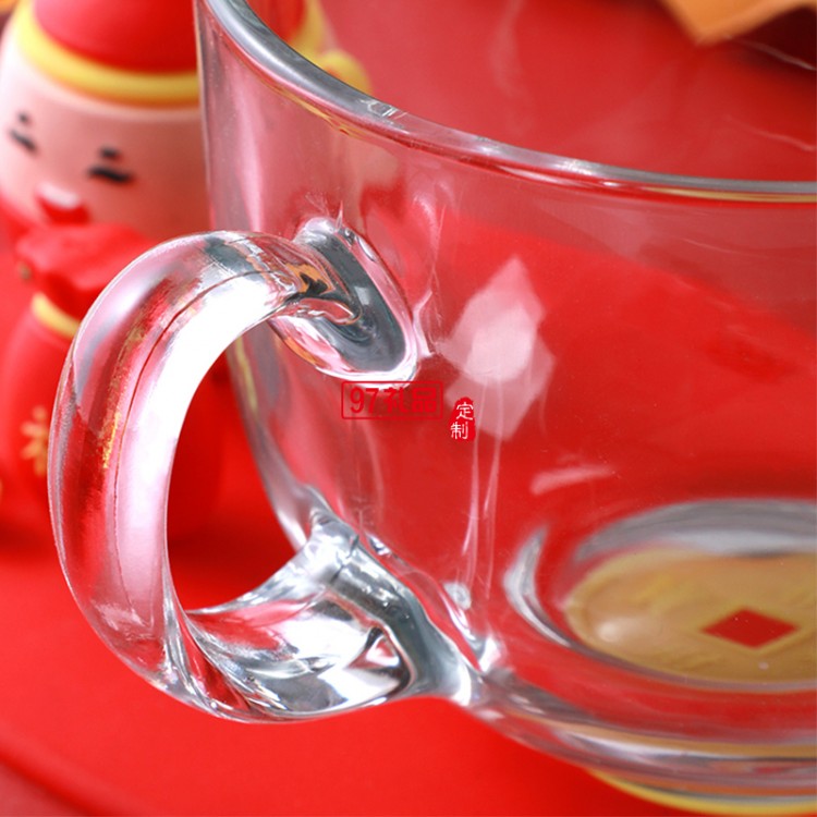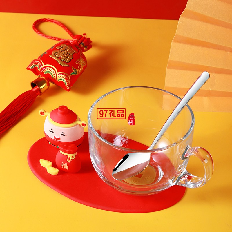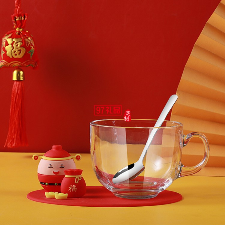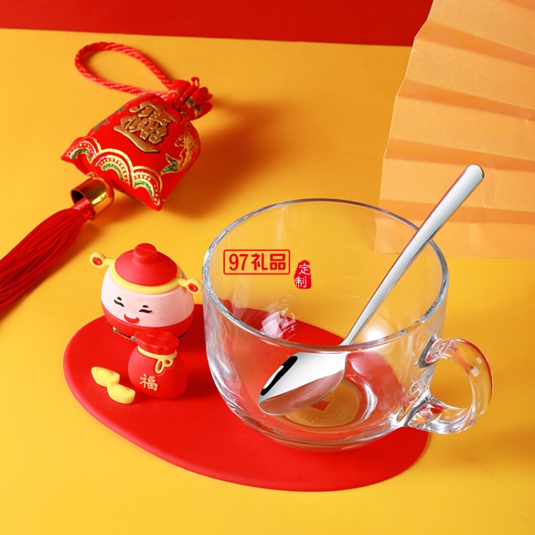 產(chǎn)品特點(diǎn): 杯子玻璃+PVC杯墊,攪拌勺不銹鋼材質(zhì)。獨(dú)特的財(cái)神爺和福袋設(shè)計(jì),寓意招財(cái)進(jìn)寶。原創(chuàng)設(shè)計(jì),圖案可定制。